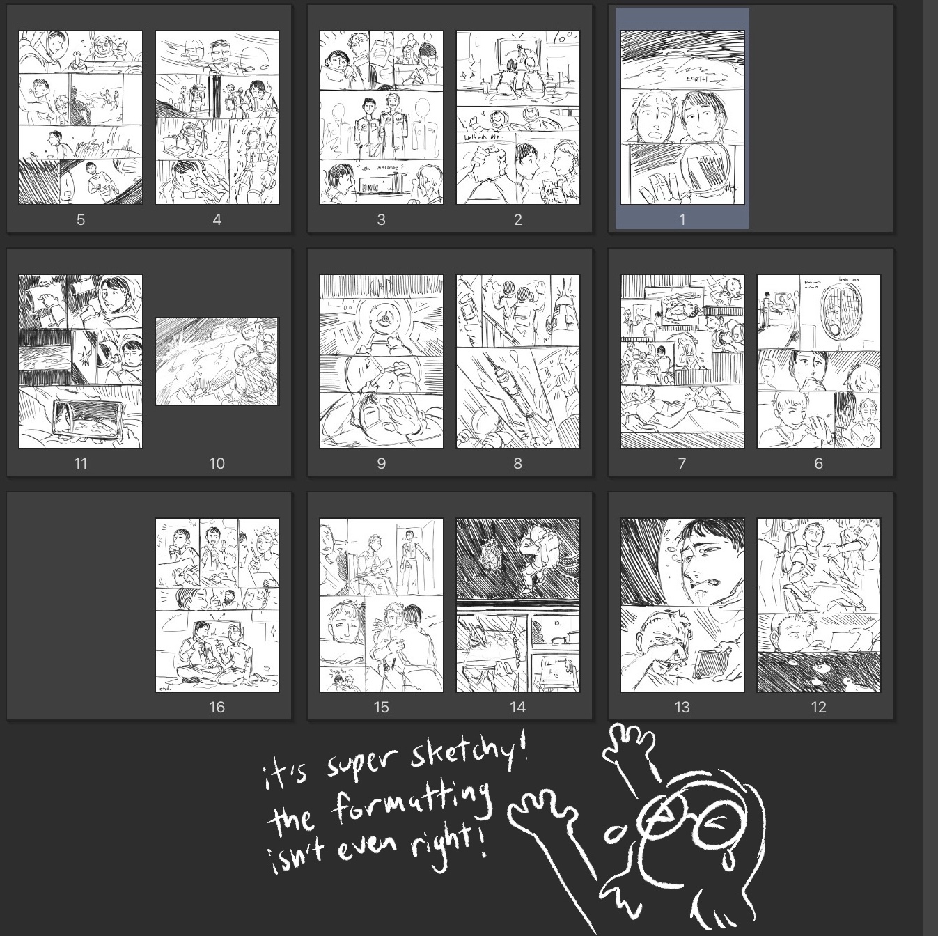 The time limit + my current drawing ability = oh no oh god oh no. I had to draw faster than expected, and the ending was visibly rushed, which the judges noticed (I’m sorry!). I did learn new methods of saving time while drawing, so I’m excited to use them in my next project. I also had to do a lot of research on space technology, as I wanted the training sections and the spacecraft itself to feel real. I cheated a little bit at the end, though. A space station camera isn’t really approachable like that. Sorry to whoever was reading from the international space station. You must get nice WiFi.